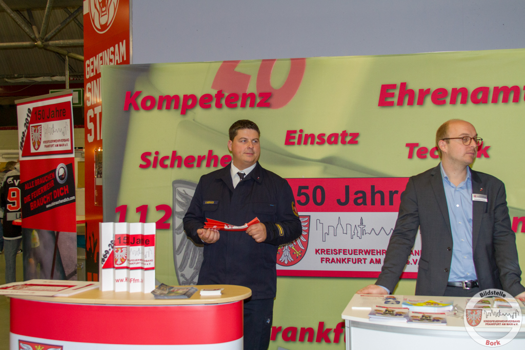 Die Presse- und Medienarbeit (PUMA) des Kreisfeuerwehrverbandes war den kompletten Abend über mit ihrer neuen Infowand und einem Infostand zum Thema "2019 - 150 Jahre Kreisfeuerwehrverband Frankfurt am Main e.V." und zahlreichen Werbemitteln für Groß und Klein kompetenter Ansprechpartner in der Eissport-Arena.