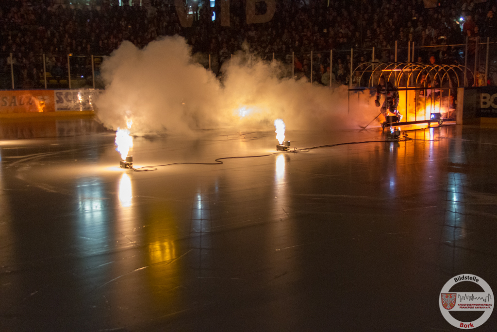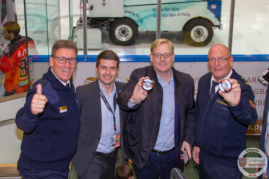 In der ersten Drittelpause gab Pressesprecher Markus Heuser unter dem Motto "Fire and Ice - das passt!" dem Stadionsprecher ein Interview zu den Themen Aufbau und Struktur des Kreisfeuerwehrverbandes, was sind die Gemeinsamkeiten der Löwen und der Freiwilligen Feuerwehr in Frankfurt am Main, Infos zur Hessen-Kampagne "Solidarität für Einsatzkräfte" und schließlich einen aktuellen Überblick über die beiden Groß-Events am 01.06. und 02.06.2019 im Rahmen des großen Kreisfeuerwehrverbands-Jubiläums.