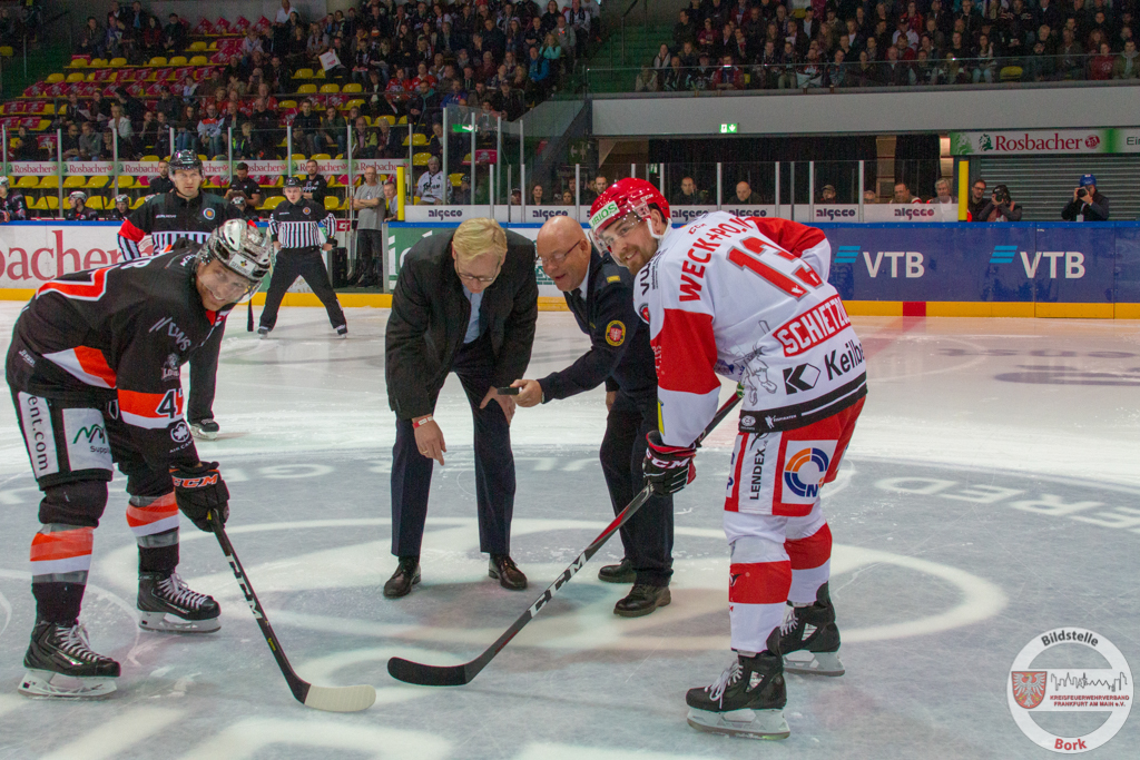 Unser Kreisfeuerwehrverband Frankfurt am Main wiederum war an diesem Abend in der "Höhe der Löwen" stark vertreten: der 1. Vorsitzende des Kreisfeuerwehrverbandes und Stadtbrandinspektor Dirk Rübesamen eröffnete zusammen mit Stadtrat und Feuerwehr-Dezernent Markus Frank symbolisch mit einem "trop-down" das Spiel gegen das Team aus Crimmitschau.